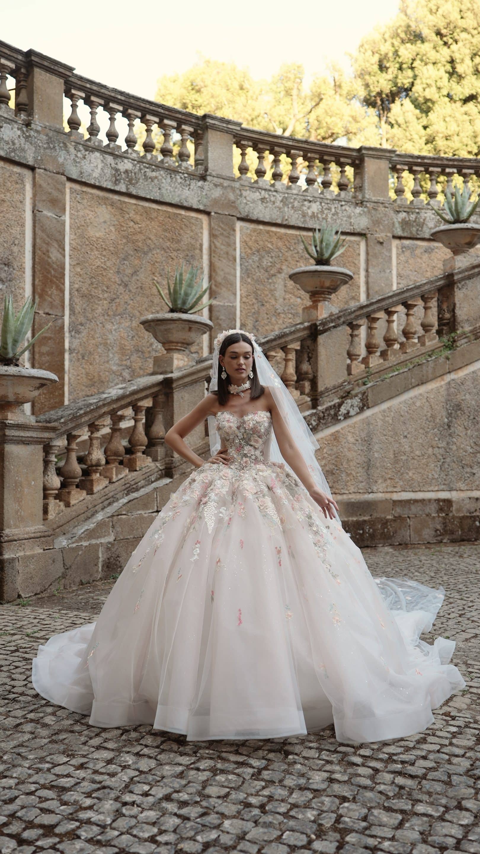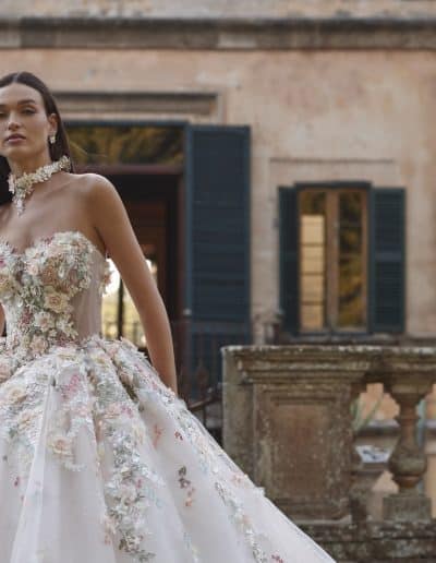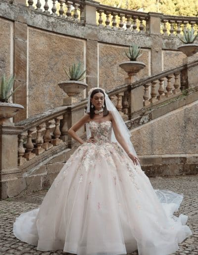 Step into a fairy-tale with this exquisite ballgown wedding dress, featuring a strapless sweetheart neckline and a voluminous tulle skirt adorned with delicate 3D floral appliqués. Soft pastel hues and shimmering details create a romantic, ethereal look perfect for the modern princess bride. Ideal for grand celebrations or outdoor garden weddings, this gown captures timeless elegance with a touch of whimsy.