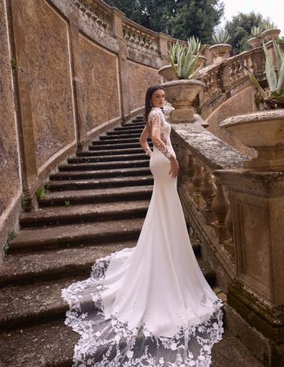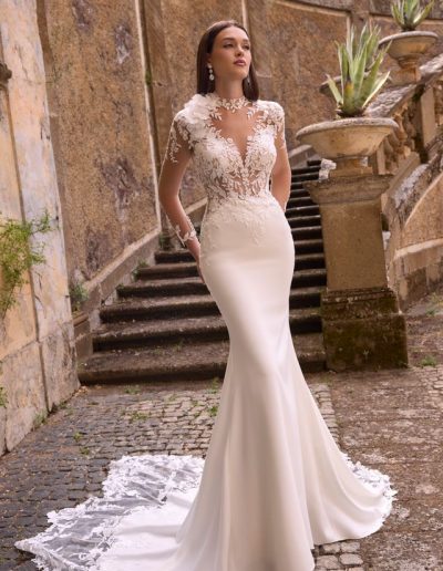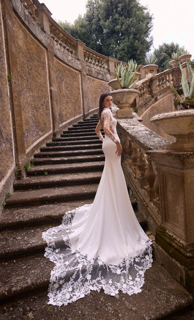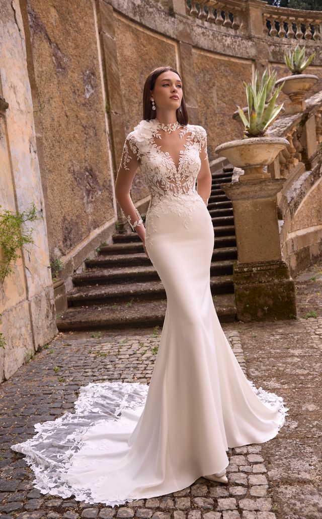 A sleek and modern fit and flare wedding dress, featuring a high illusion neckline adorned with delicate 3D floral motifs and elegant full-length illusion sleeves. Cascading bridal buttons trail down the back, leading to a beautifully detailed lace scallop hem. This contemporary yet romantic design exudes sophistication and timeless grace for the modern bride.