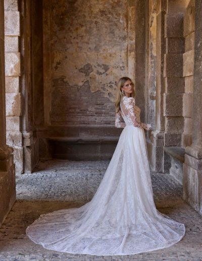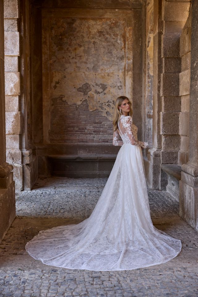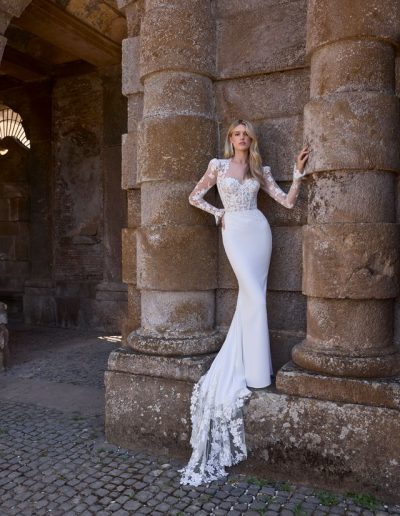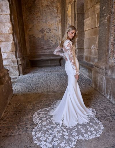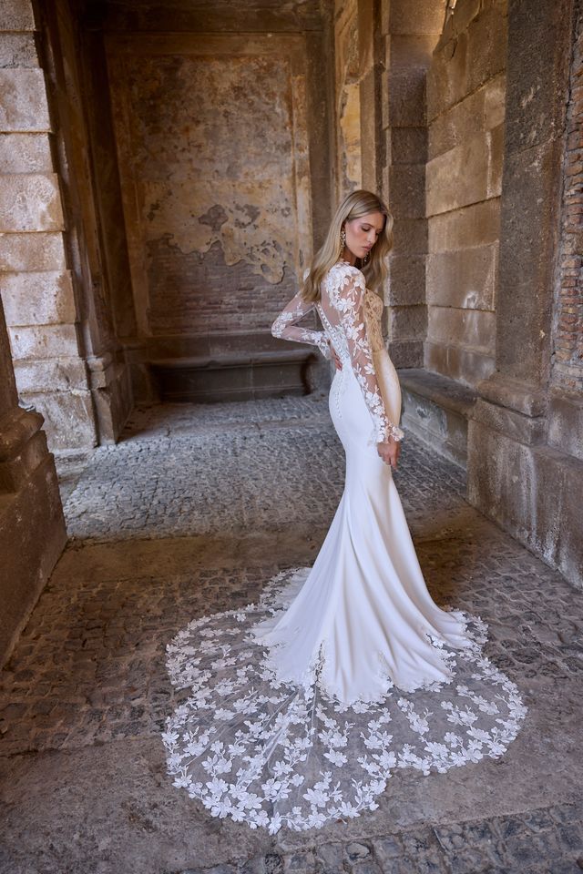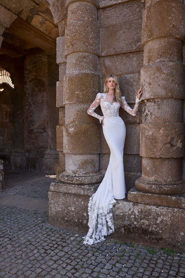 A sleek, fitted wedding dress featuring a botanical lace bodice and full-length illusion sleeves with delicate ruffled cuffs. The wide sweetheart neckline enhances the romantic silhouette, while the plain skirt flows elegantly to a lace scallop hem, combining modern sophistication with timeless bridal charm.
