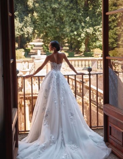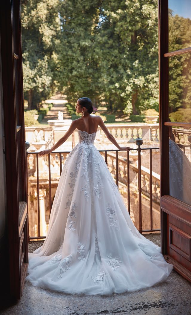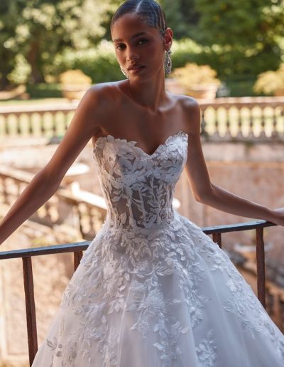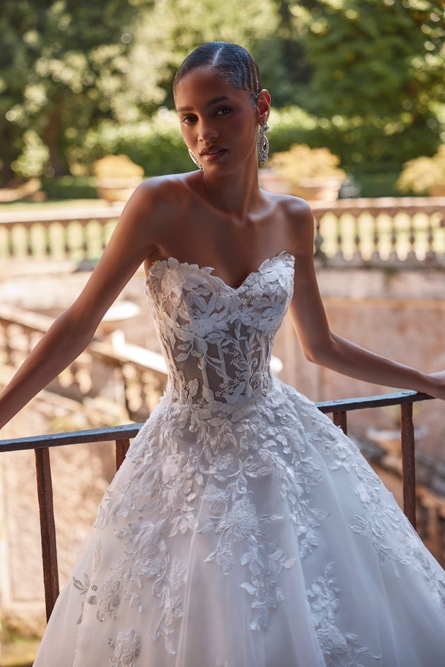 Step into timeless elegance with this breath-taking ball gown wedding dress, featuring a sweetheart neckline and a structured corset bodice adorned with delicate floral lace appliqués. The voluminous tulle skirt flows gracefully, creating a regal silhouette perfect for a fairytale moment. Ideal for the bride who dreams of classic romance with a modern touch.