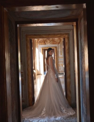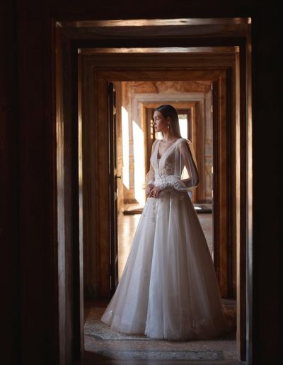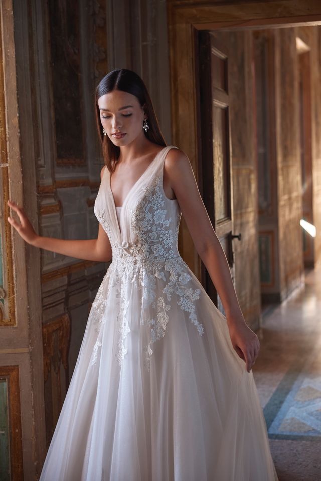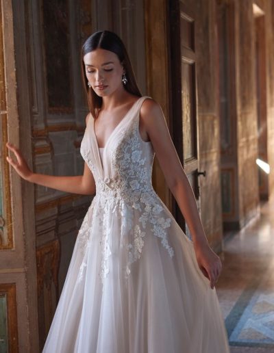 A whimsical A-line wedding dress featuring a deep V-neckline, detachable sheer bishop sleeves, and a deep V-back. This enchanting design is adorned with floral beaded lace appliqués and finished with a delicate bow detail on the bodice.