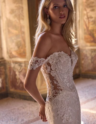 A stunning botanical fit-and-flare wedding dress featuring an off-the-shoulder sweetheart neckline and delicate lace cap sleeves. The bodice is pleated with illusion side panels and adorned with cascading floral appliqués for a romantic, feminine finish.