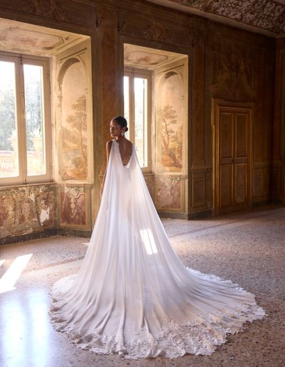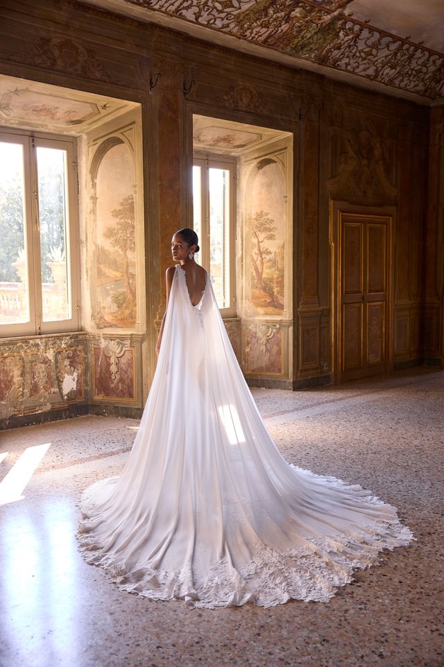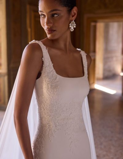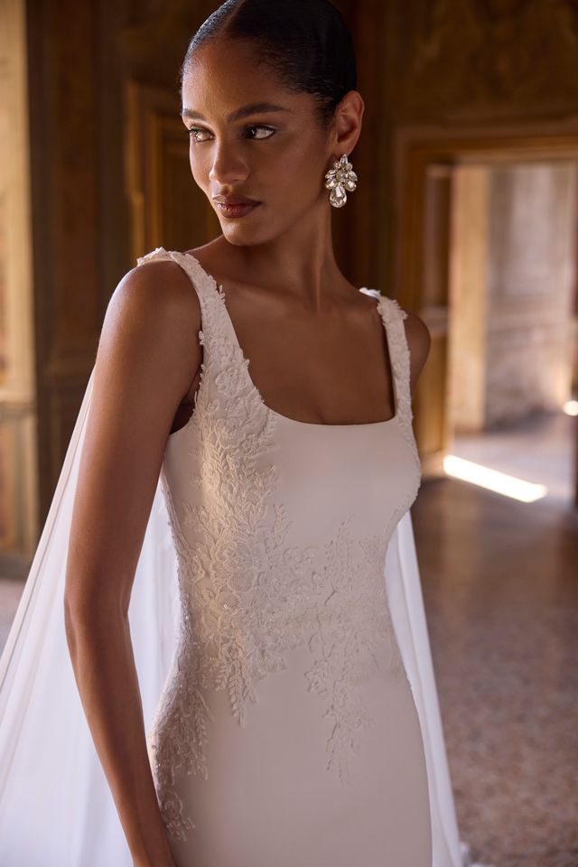 This contemporary wedding dress features a sculpted fit-and-flare silhouette. The neckline is a chic, modern square cut supported by wide straps. The fitted bodice is adorned with subtle, intricate beaded embroidery that creates beautiful texture along the side.